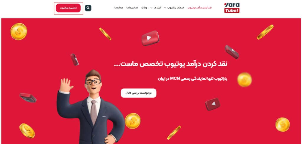 در مرحله اول شما می توانید وارد صفحه اصلی سایت یاراتیوب شوید و روی گزینه داشبورد یاراتیوب کلیک نمایید
