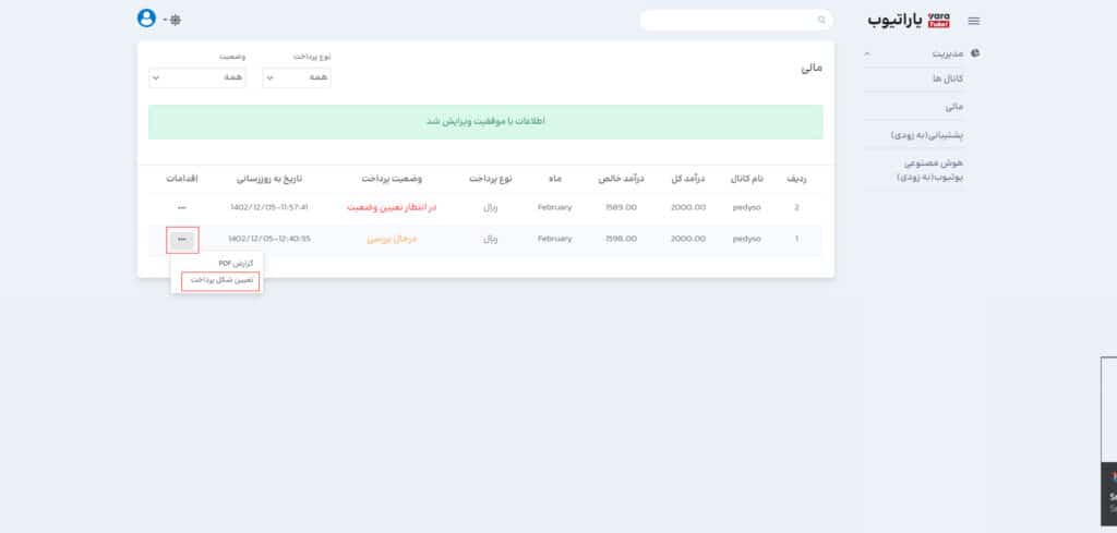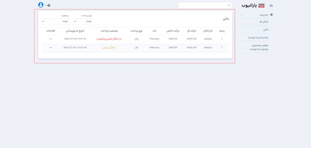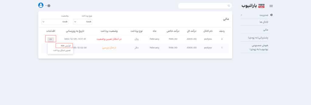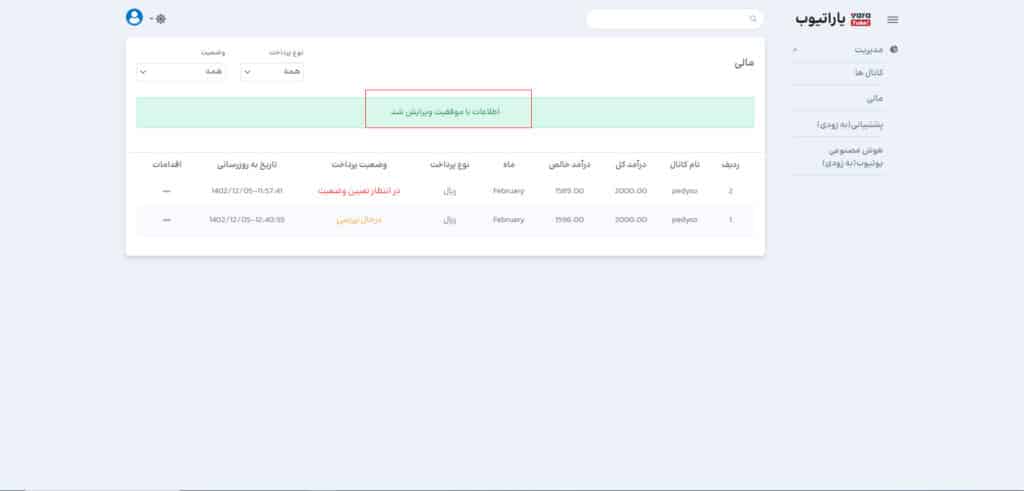 در قسمت مالی همانطور که مشاهده می نمایید درآمد شما نمایش داده شده است(پس از دریافت پیامک تعیین وضعیت از سمت یاراتیوب) و اطلاعاتی از درآمد در اختیار شما قرار گرفته است.