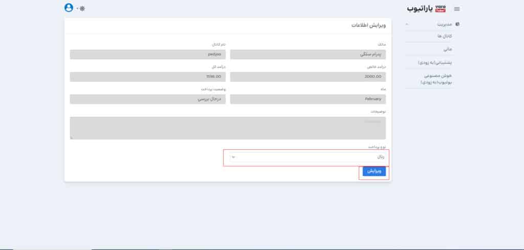بعد از این که اطمینان حاصل کردید که اطلاعت کانال شما به درستی وارد شده است باید وارد قسمت مالی شوید