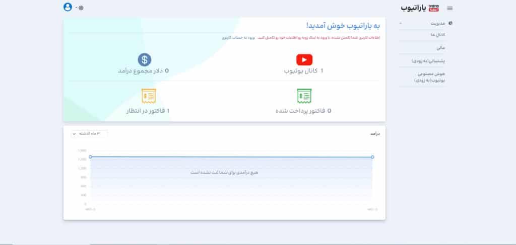 داشبورد یاراتیوب ابزاری ساده و کاربردی برای مدیریت مالی کانال یوتیوب شما است. در حال حاضر، امکان دریافت گزارشهای مالی و تعیین روش پرداخت درآمد فراهم شده، اما بهزودی امکانات حرفهایتری به این داشبورد اضافه خواهد شد. اگر در هر مرحله با مشکلی مواجه شدید، میتوانید از پشتیبانی یاراتیوب کمک بگیرید.