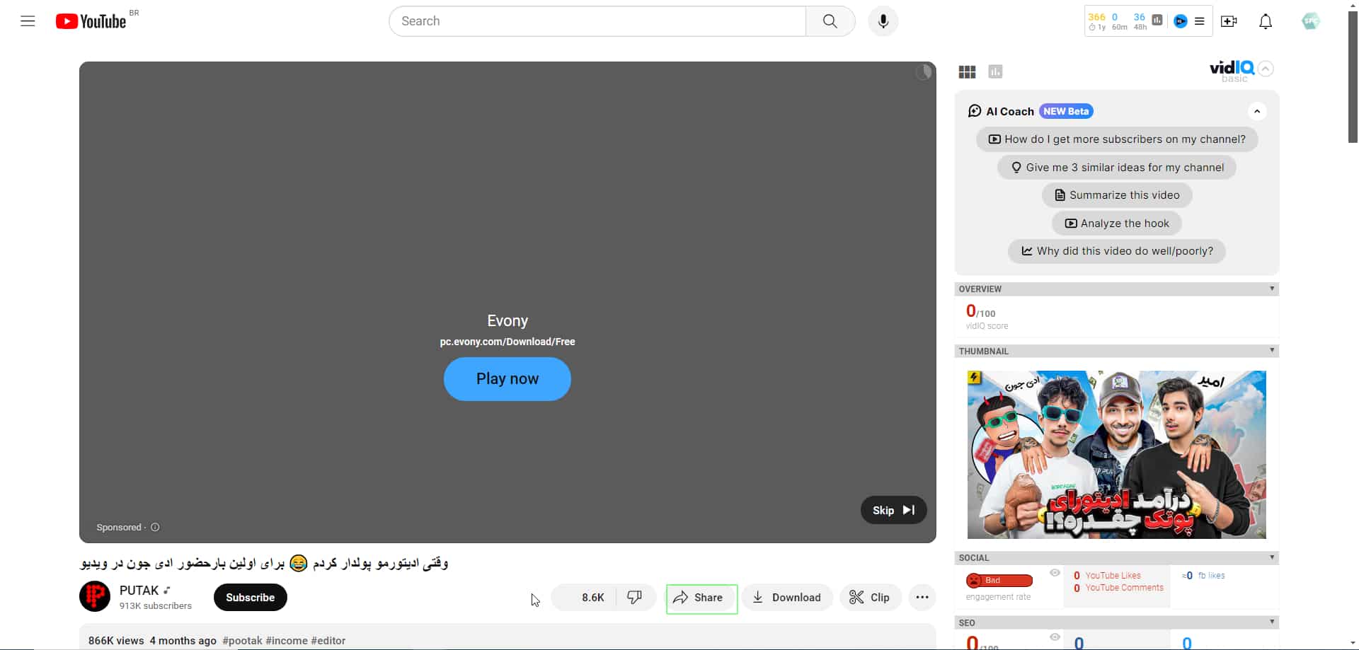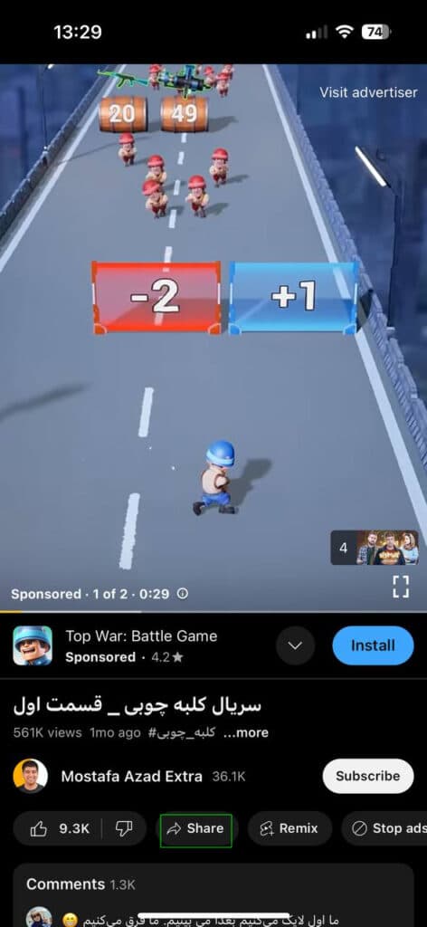 3.در زیر ویدیو، روی دکمه "اشتراکگذاری" یا "Share" کلیک کنید. این دکمه معمولاً با نماد یک پیکان یا نمادی شبیه به نشان و یا کلمه "اشتراکگذاری" مشخص میشود.
