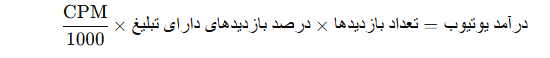 فرض کنید یک ویدیو ۱۰۰,۰۰۰ بازدید داشته باشه و نرخ CPM برابر ۲ دلار باشه و ۵۰ درصد بازدیدها شامل تبلیغ بشه: