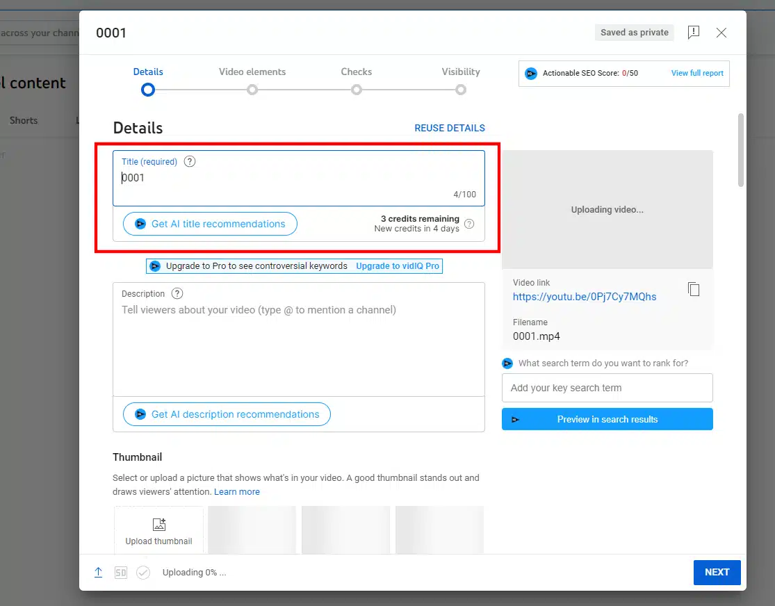 بعد از اینکه آپلود ویدئو شروع شد، میتوانید در کادر تایتل عنوان ویدئو خود را وارد کنید. حتما قبل از تولید محتوا اسم مناسبی برای ویدئوی خود انتخاب کنید. و در قسمت تایتل اسم ویدئوی خود را بنویسید.