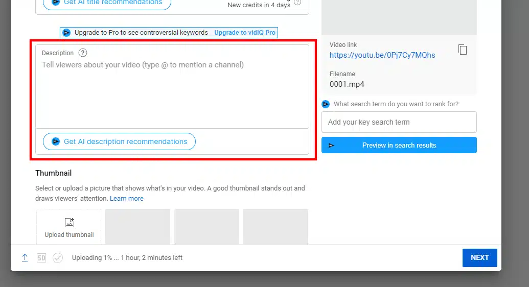 5- هنگام آپلود ویدیو، می توانید اطلاعاتی مانند توضیحات ویدیو را وارد کنید. بعد از تمام کردن این کار، روی Next کلیک نمایید.